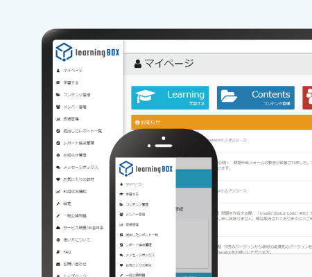 eラーニング作成システム(学習管理システム)です。今までの対面で行ってきた教育や紙で行っていた試験、集合で行っていた研修など、教育をWEBで提供・管理し、学習を補完することを実現するシステムです。弊社のeラーニング学習システムである、『learningBOX』は約2,300もの企業様がWEB上に学習環境を構築されています。主に、学校の先生、企業の教育担当者様にご利用いただいております。