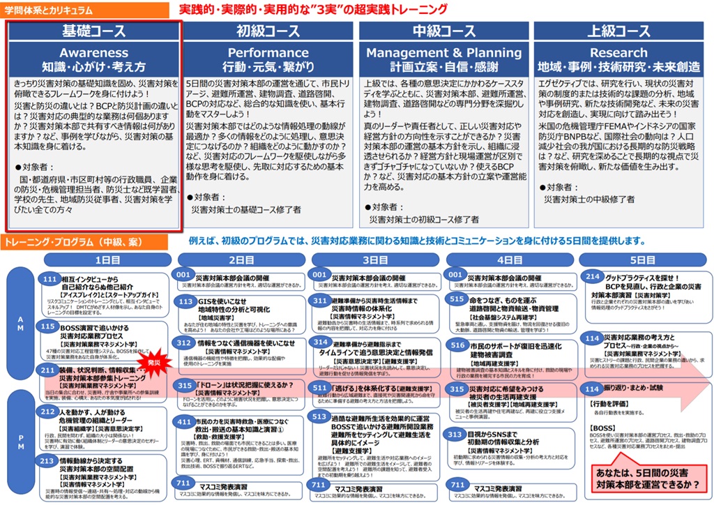 上級の内容は、企業でいうと、決裁権のある役職の方を、災害対策のリーダーとして育成するプログラムとなっています。基礎コースは、夏頃には開始したいと考えています。