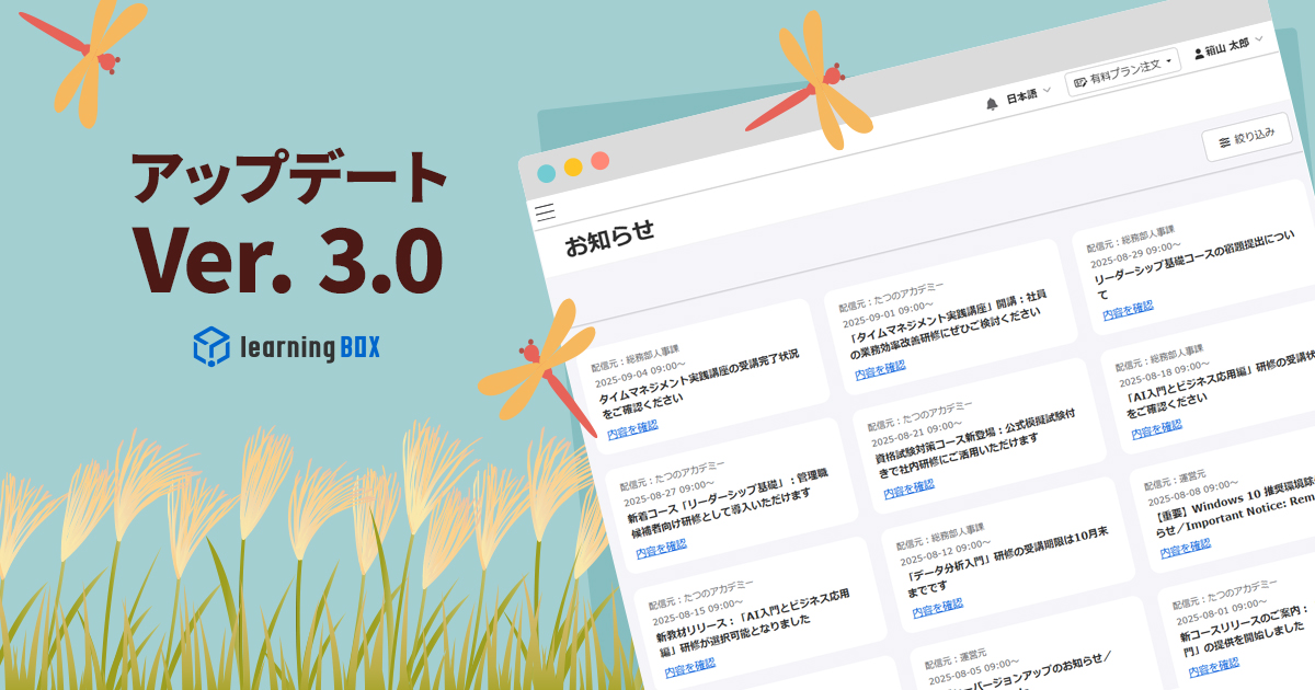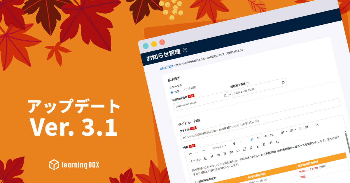 learningBOXをご利用いただき、誠にありがとうございます。さて、本日、learningBOXがVer. 3.1へアップデートいたしました。アップデートで追加・改修された各種機能についてご紹介いたします。