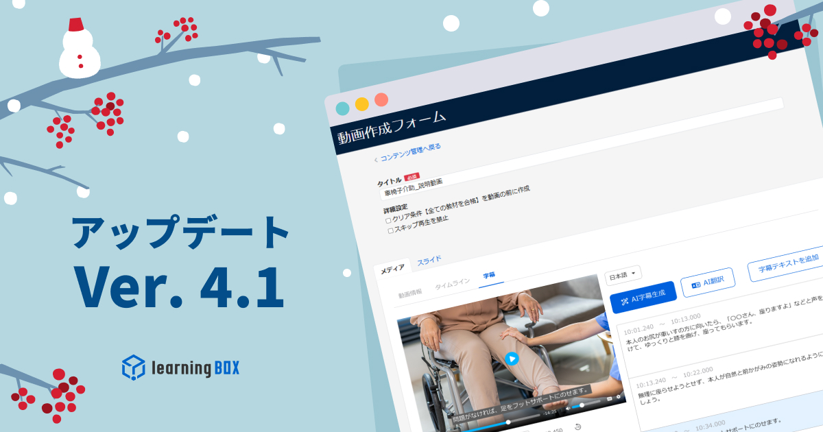 learningBOXをご利用いただき、誠にありがとうございます。さて、本日、learningBOXがVer. 4.0へアップデートいたしました。アップデートで追加・改修された各種機能についてご紹介いたします。