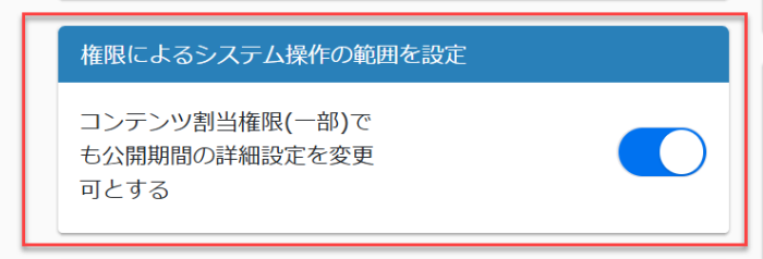 設定項目:「コンテンツ割当権限(一部)でも公開期間の詳細設定を変更可とする」を On にする