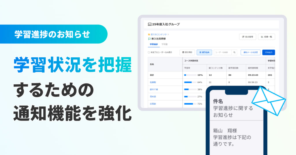カルテ画面からも、学習が完了していない受講者に対して学習を促すためのお知らせを通知できるように、強化しました。
