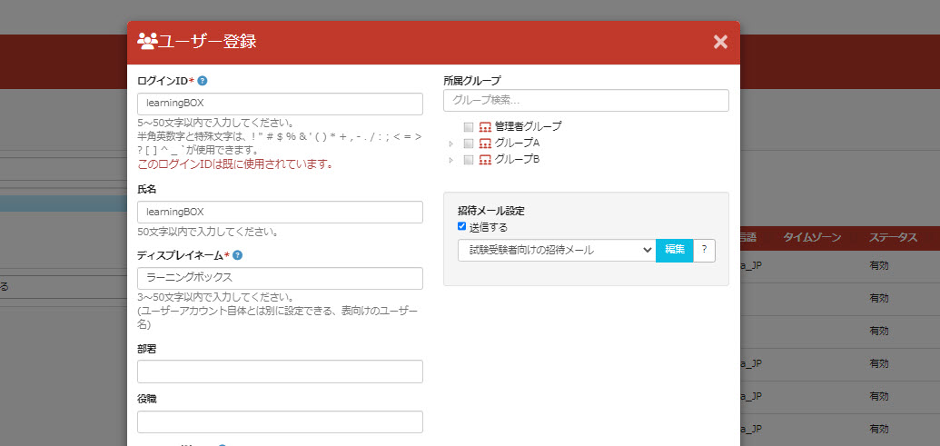 When registering a user, if the user duplicates content used in another owner-administrator's environment, the message "This 00 is already in use." will be displayed.