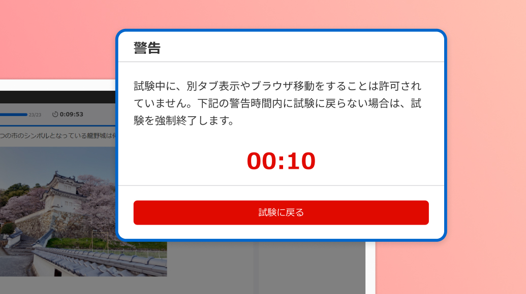 フルスクリーン解除やブラウザ移動をした際に警告や試験の強制終了ができます。また、試験中の写真撮影が可能です。