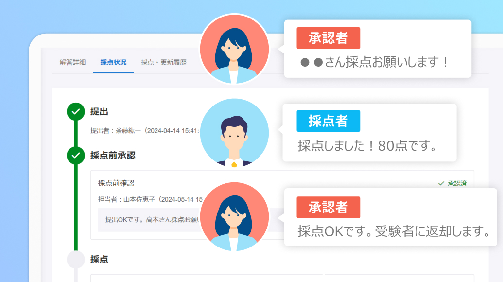 複数人で確認しながら採点する必要がある場合に、採点の手順や採点者ごとの役割・権限をあらかじめフローとして設定できます。